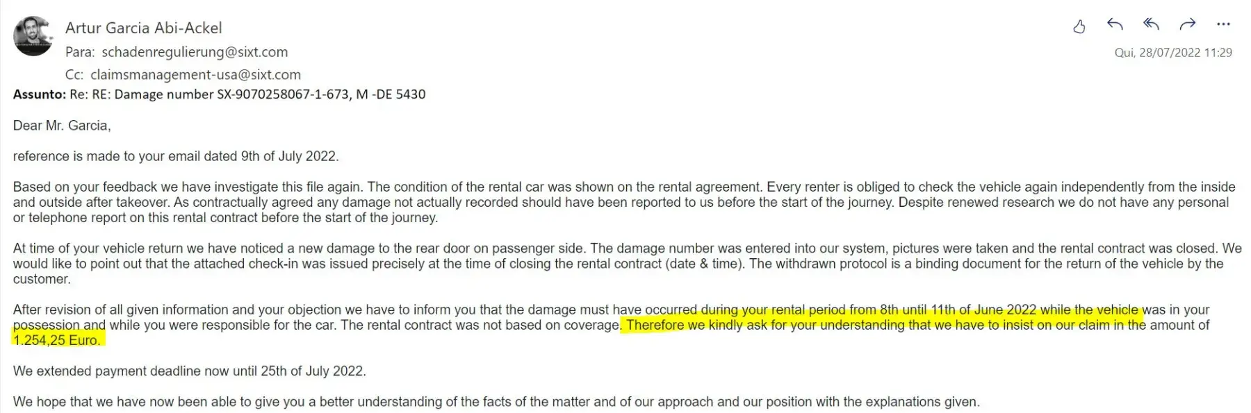 Desired outcome: I would like that Sixt review the price they are charging me for the damage and reduce it to 241.26 EUR which is the fare price.