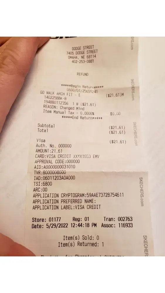 I contacted Sketchers on 9/11 regarding the issue and never received a response back. I used $35 worth of rewards I had earned when I purchased the sandals and when I had to return them due to the fit not being right I was not credited my reward points back. Below is the info from the purchase receipt and I'm attaching a photo of the return receipt.