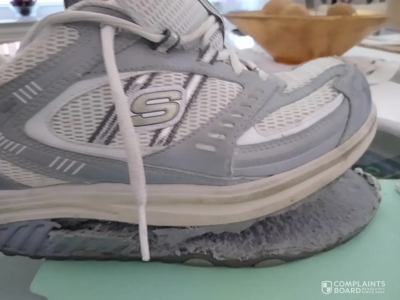 I contacted Skechers several years ago regarding the deterioration of the foam on the left shoe and got no satisfaction. I thought I had thrown the sneakers away, until I discovered them once again. I figured that I would try to get some wear out of them. But I essentially had to walk home barefoot because they blew up completely.