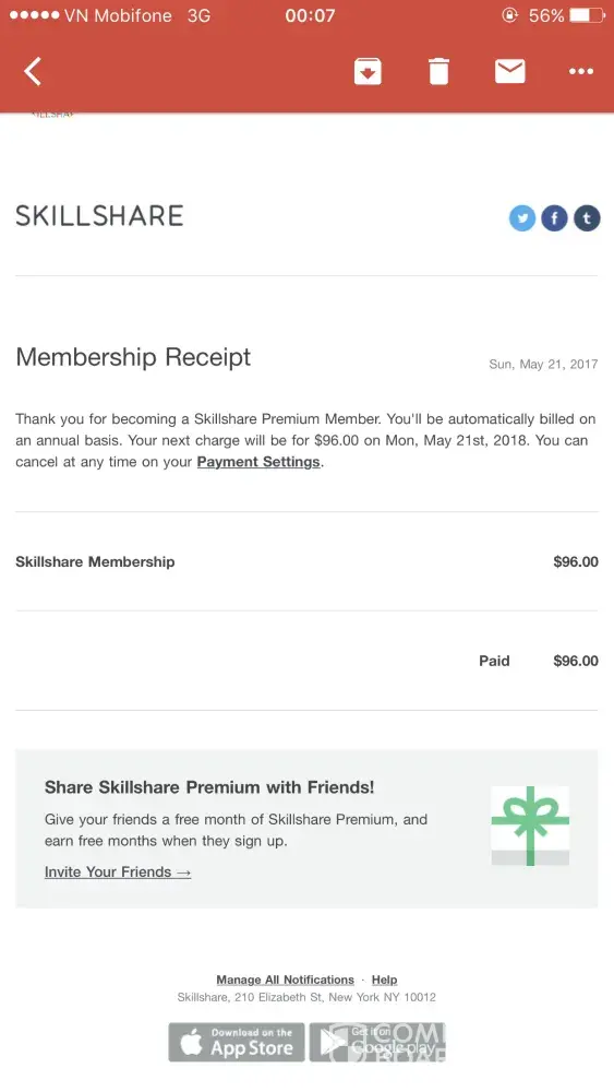 I just got a bill stating that skillshare charge 96 dollars from my account because my trial had ended and they automatically set up an annual membership. Why this would happen? Why there was not anything announcement to me prior to the day you made a transaction?