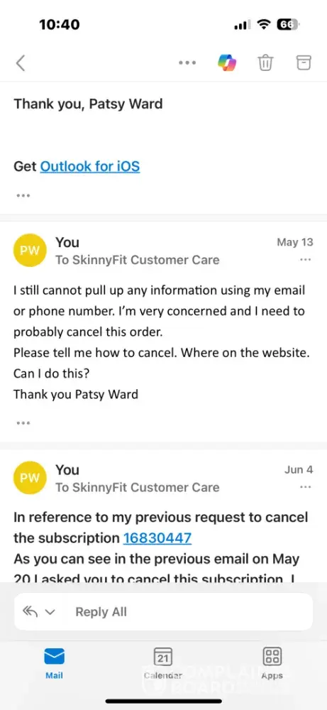I ordered skinny fit on a trial basis, 4/9/25 $6.53, received product and was happy with product. Then on 4/30 $65.80 was taken out of my account because it had been 21days and I paid for the product. On may 5th I called skinny fit, changed my account to every 45 days unflavored product. On 5/7/25 $76.72 was taken out of my account and a pending withdrawal...