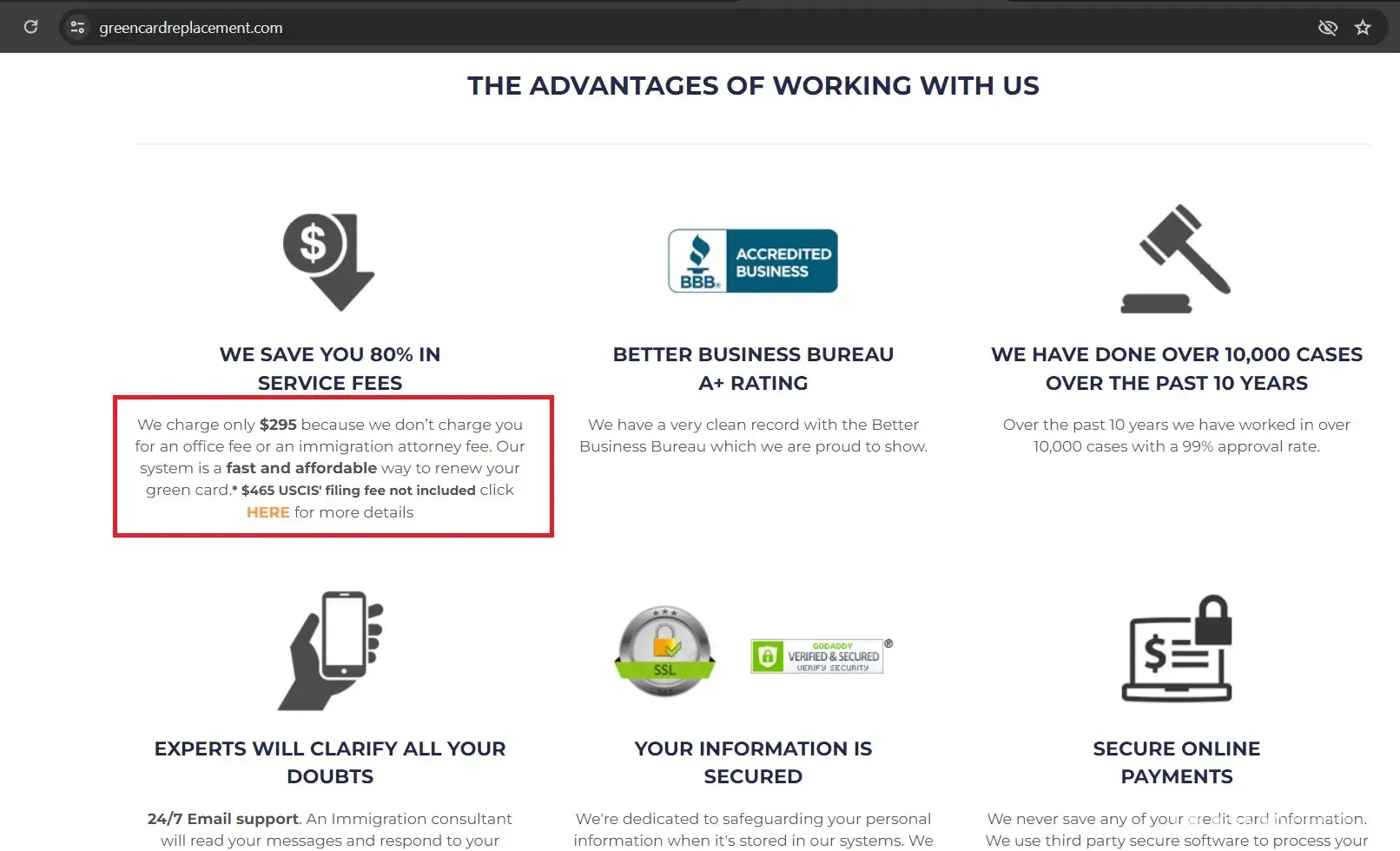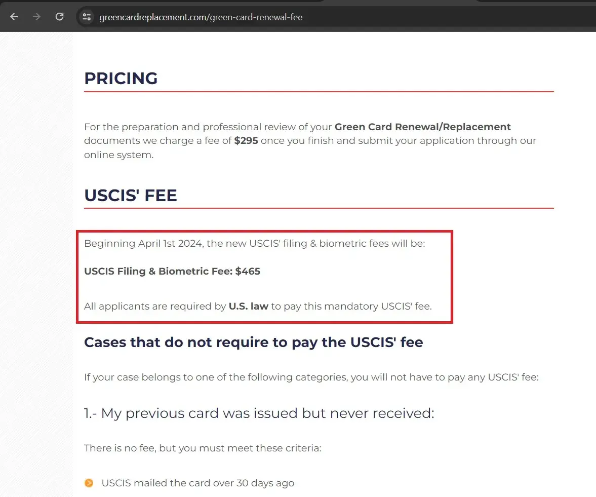 Oh and BTW they noted that the USCIS processing fee of $465 is not included. The actual fee to USCIS is $415. There goes another $50.00. Oh, and they said they were saving me 80% because I wasn't going to need a lawyer. Well, I didn't need a lawyer. It is a straight forward renewal with no complications. I have now filed directly with the US Government site. I had a letter within 3 days confirming my application and extending my green card by 2 years. DO NOT USE THESE CROOKS!