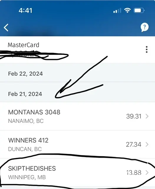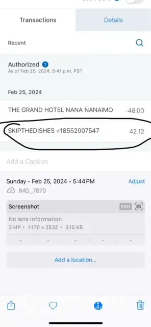 On my mastercard bank statement i noticed that skip the dishes has appeared twice this past week and i have not used this service since 2022. One charge was yesterday Feb 25th, it was authorized, i took a photo of it and have now returned home from my travel and the transaction has been since removed. ($42.12) The other charge is Feb 21st for $13.88. Please check the location of the service because i was in two distinct cities on the 21st and my credit card picture attached reflects where i was those days. I would like $13.88 reversed and please cancel any credit card reference you have in my name.