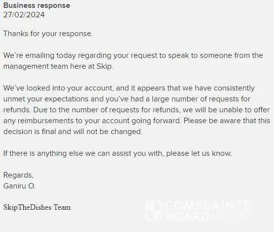 - While SkipTheDishes has a high level of trust, our investigation has revealed that the company's complaint resolution process is inadequate and ineffective. As a result, only 1% of 300 complaints are resolved. The support team may have poor customer service skills, lack of training, or not be well-equipped to handle customer complaints.