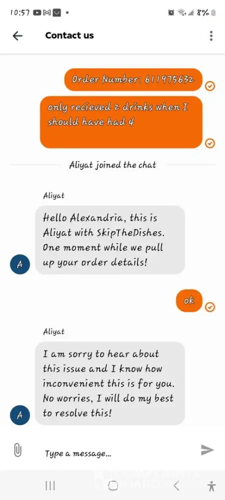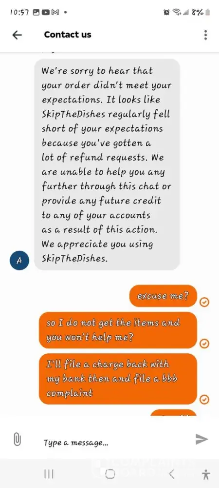 Constantly missing items in orders or orders not being correct and instead of being a understanding or caring company they fail to hit the mark so many times and their solution is to ban customers from getting any refund or replacement 🤔 they need to be sued and boycotted! Today I order a simple meal for my family from 711. 4 slices of pizza and 4 pops but only recieved 2 pops and a muffin which I didn't order so I complain and they said to bad so sad you are not allowed to complain ever again. I just wanted the drinks and now I've had $10 stolen from me and 2 family members without a drink and the pizza wasn't even fresh. Skip the dishes is garbage and no one should use them again! I'll start class action lawsuit and I know thousands will join me if they don't care about their long time customers or ensuring accuracy they need to be taken down! Skip is the worst out of door dash and ubereats just avoid skip and they will hopefully be a thing of the past soon