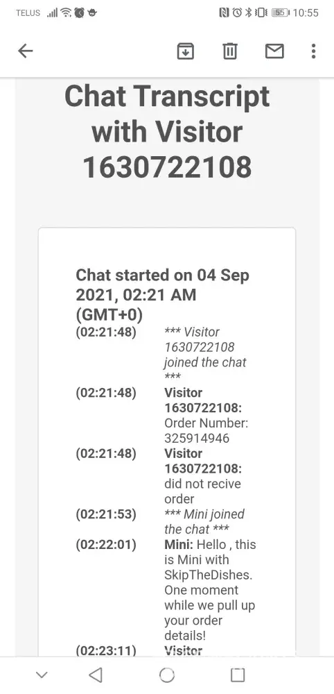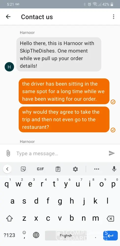 I am contacting you regarding the horrible customer service that we recieved today. I am a gold status member of skip the dishes but will not ever be ordering from you guys again. Your courrier accepted my trip and was supposed to be driving to the restaurant. Instead of going to the restaurant they sat in the same place for over twenty minutes. When I contacted support I was told "you can cancel and have no refund" the support team was very rude and unhelpful. I will tell everyone I know to never deal with skip the dishes after today. You lost a very faithful customer and gold status member. Hanoor was the name of the customer service person and the reason that we will never be back. I've added a snap shot of our convo
