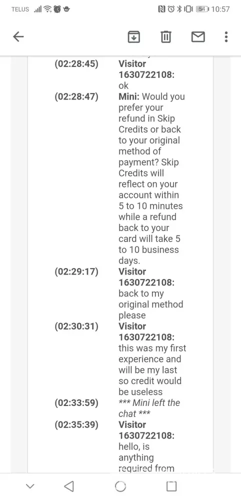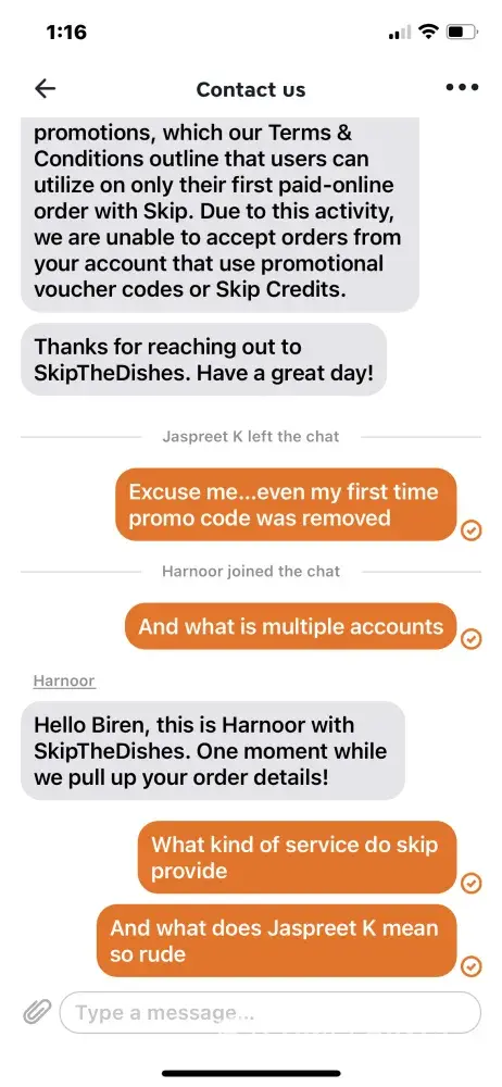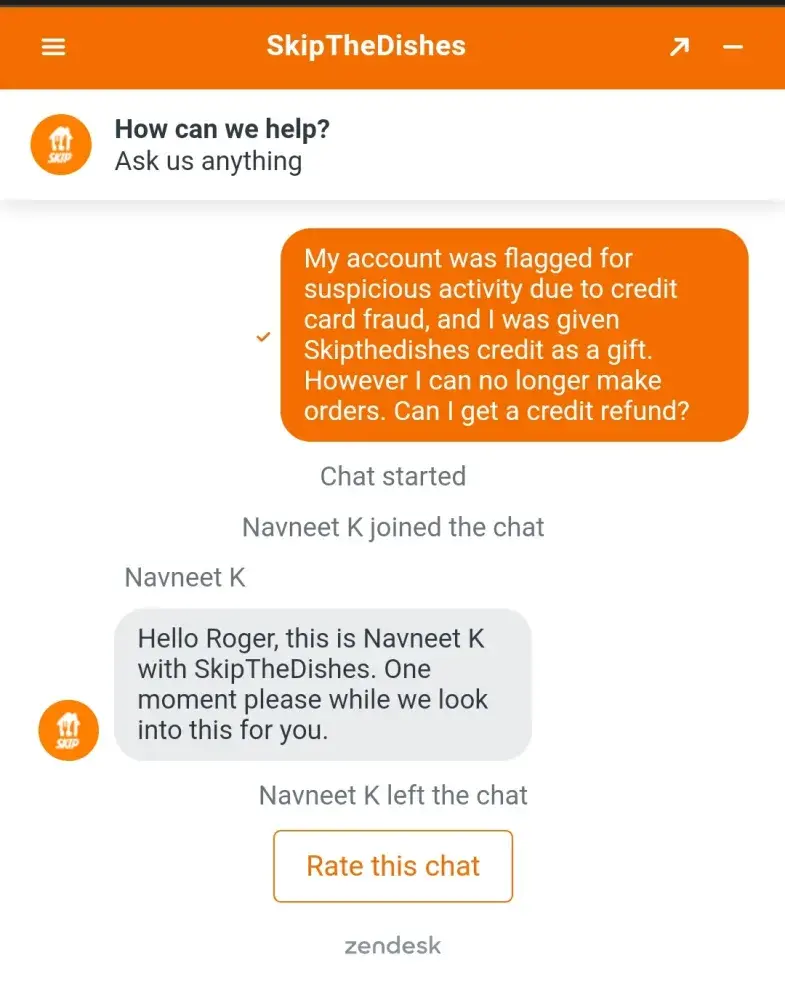 I was later told by support staff through chat that my account was flagged for suspicious activity and because of that I am unable to place any orders. Since then, I've been trying to get through Support staff on the SkiptheDishes website repeatedly but they leave as soon as I ask for my problems to be solved! Sometimes, without even saying anything!