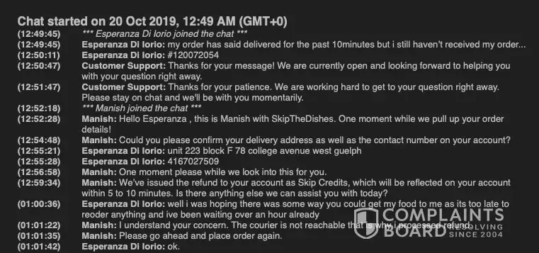 Will never ever ever in a million years put myself through that hassle again. They deliver make it almost impossible to reach them in the event of a problem. They seem to do this intentionally so you give up on getting reimbursed. If a food place uses skip the dishes I suggest you skip on over to another food place. They are an absolute disgrace in customer support/service & their payment platform failed on their end of things and they couldn't fix the problem. They told me in chat that my $ was ‘lost in a cyberspace phantom zone'.