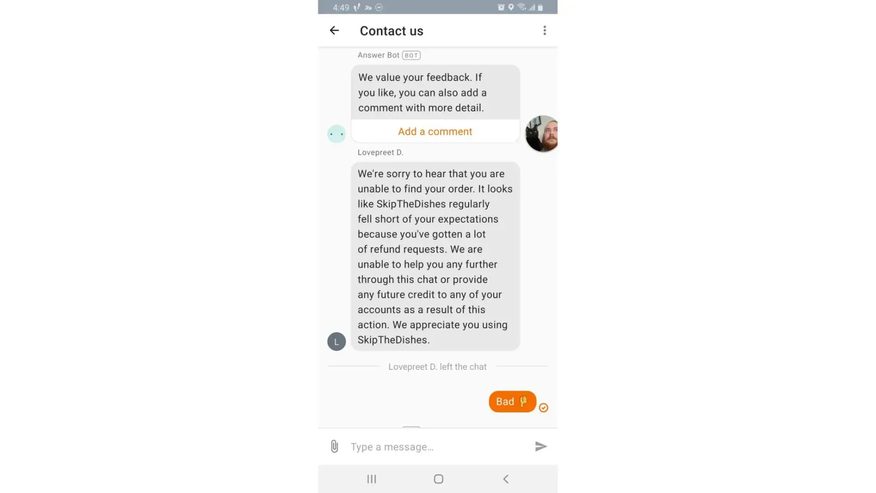 I am complaining about the skip the dishes agent.
