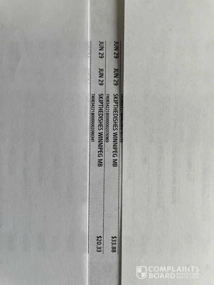 I have never used Skip the Dishes but for some reason you have my credit card number in your system. I live 1 hour out of town and no-one is going to deliver Skip the dishes out to me. I have contacted my credit card company and they reversed the first 2 charges that I found on my statement. Now I have several more charges July 30 for 54.20, July 31 for 67.58 Aug 1 for 62.64, Aug 2 for 40.04. None of these charges are mine and I would like to know how to stop your company from charging my credit card in error or worse yet fraudulently.