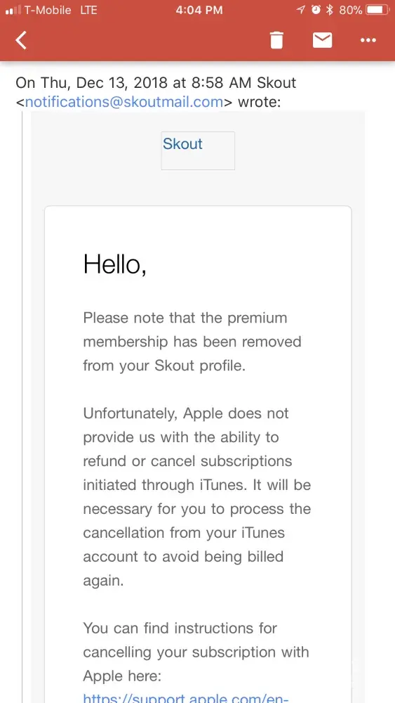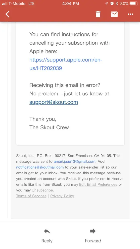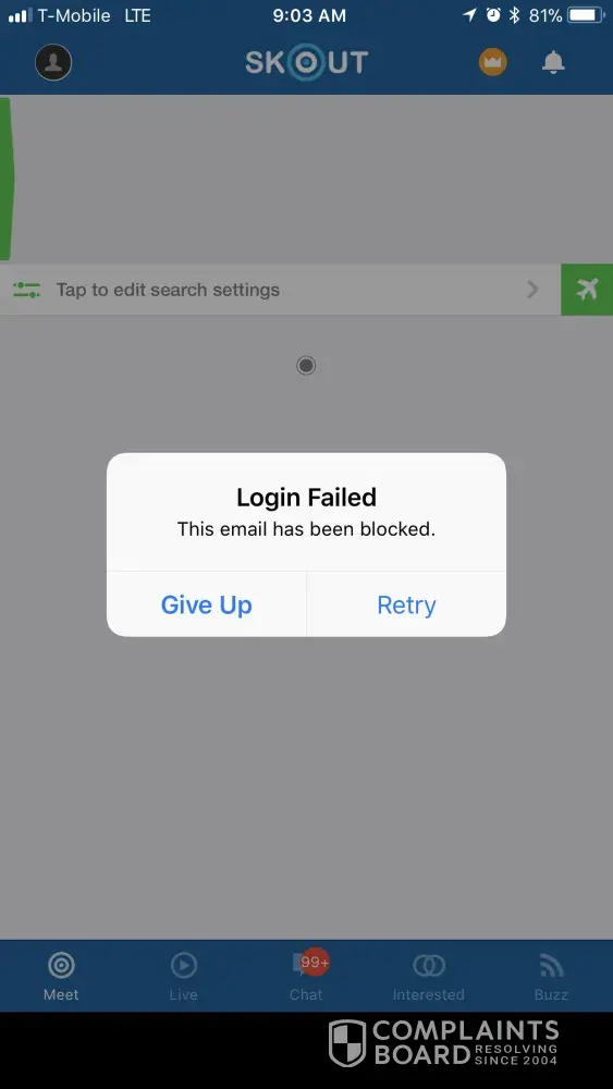 I have been a Skout member for several years.I haven't used it for awhile though.I tried to login to my account and I got a message saying login failed You have been blocked for using this service for breaking our terms of service.Appeal by emailing support@skout.com.I emailed support@skout.com.I messaged them and asked them how I violated their terms of service but they didn't reply back though