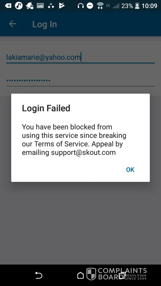 I Lakia Marie made a skout account and it randomly blocked me and logged me out saying my info is invalid. When its not. Please help me get my account back I followed the guide lines so idk why I was blocked. My meet me (purple app) has done the same thing sucks lost all my friends😢 please help me I used this email lakiamarie@yahoo.com - Lakia