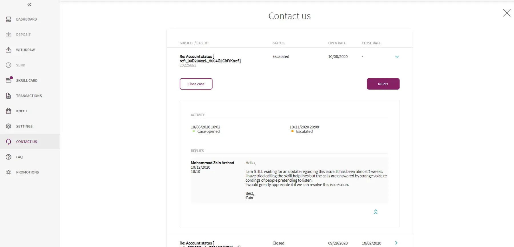 Suddenly, Skrill decides to block my account because one day I had a high outflow of money I sent out (approx. $8000), and they blocked it. Only information they provided me was that the matter has been escalated.
