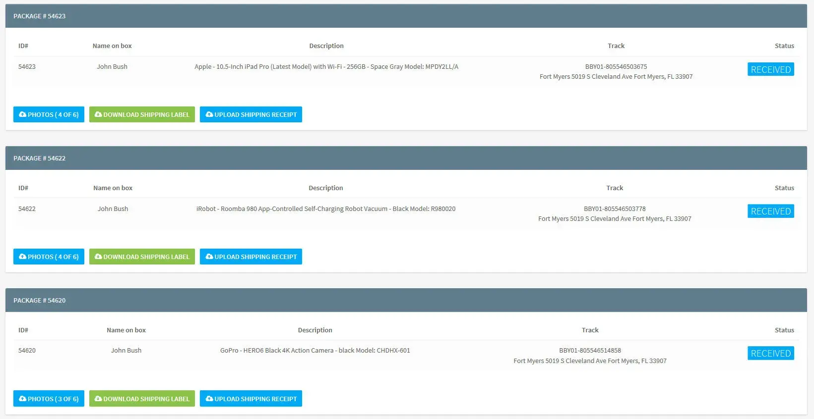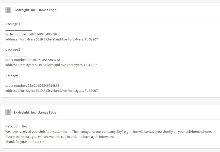 My son sent me a link to a website that offers 2700 a month flat pay for accepting packages from Fedex and taking pics of the items and the invoices and then upload and get a new label to print out and repackage and send to a new location. The company says it for people who cant get items shipped to their county. So I figure it was legit, I did the research and found no scam alert post. I applied and was called that day and told I was hired and that I could make extra money doing pickups. So I accepted and the very next day, I got my first pickups from the local Bestbuy. I picked up three orders, one had two items. And the lady behind the desk wasn't going to let me get them because I didn't know the address that was on file. And I showed it that it was my job and the website and the pickup info. She checked me out and I came home, to pics and uploaded and then got the labels to print and send. Two of the packages were going to the same person at the same address but they both had different phone #s. That was the red flag that I needed to contact the police and talk to them. They said it was very smart of me, because there have been many people dooped by fake companies like this and the police show up at their door to arrest them because the receive good that were bought with stolen credit cards. And even thought the mailed those items off, they are responsible, because they received the goods. I returned the items and told the company that I quit. I also noticed that the domain was just created on 05-05-2018. I wish I would have looked that up first.
