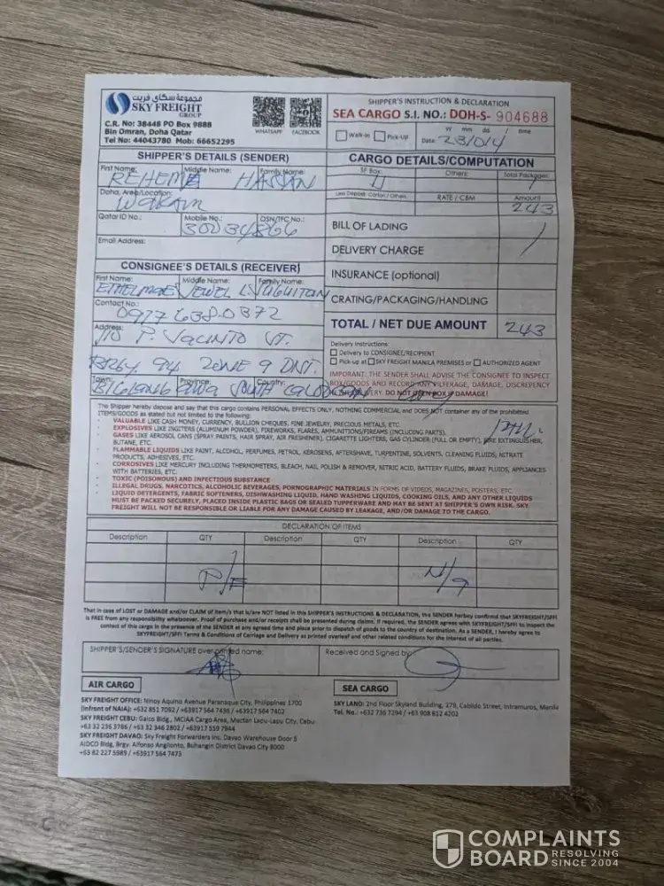Not received until this date. Tried to contact skyfrieght philippines main office but staff were rude and cutting the call. No answer until now, where and what happened to the cargo, why its taking too long to be delivered.