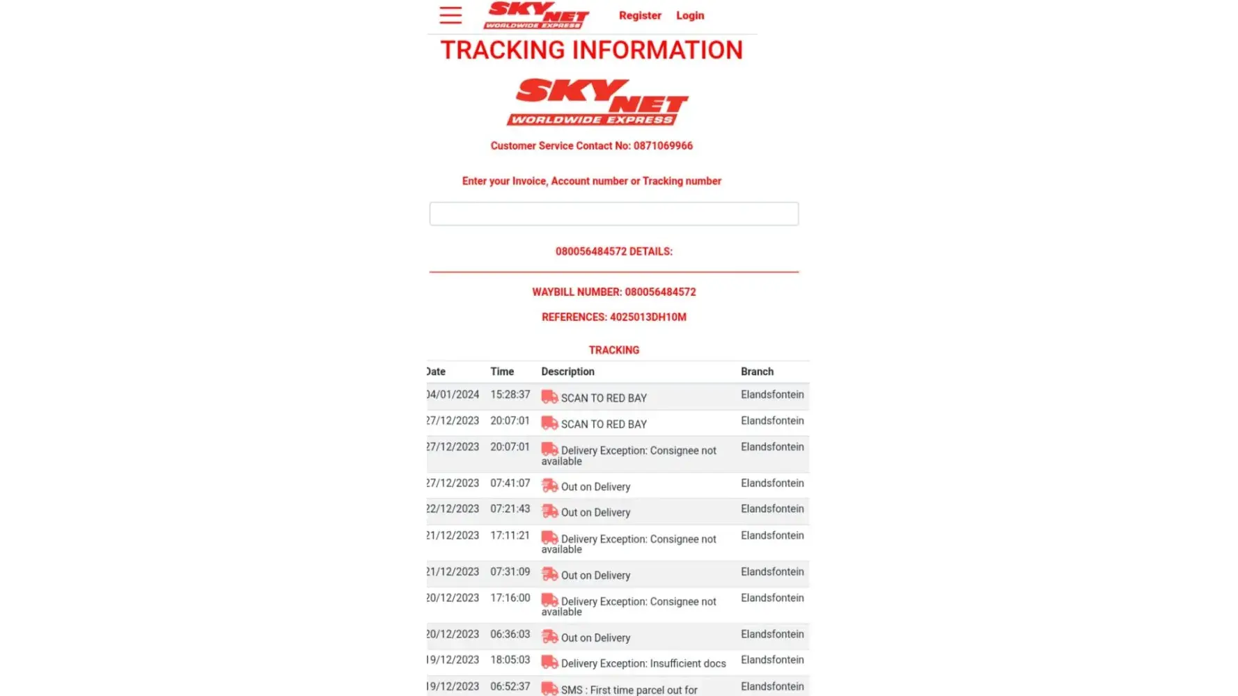 After expressing my frustrations to Skynet regarding the non-delivery of my expected parcel, I have just discovered that my complaint has resulted in a negative response. The tracking system now indicates that my parcel is marked as "SCAN TO RED BAY," with the waybill number [protected] has not been actioned since 18 Dec 2023.