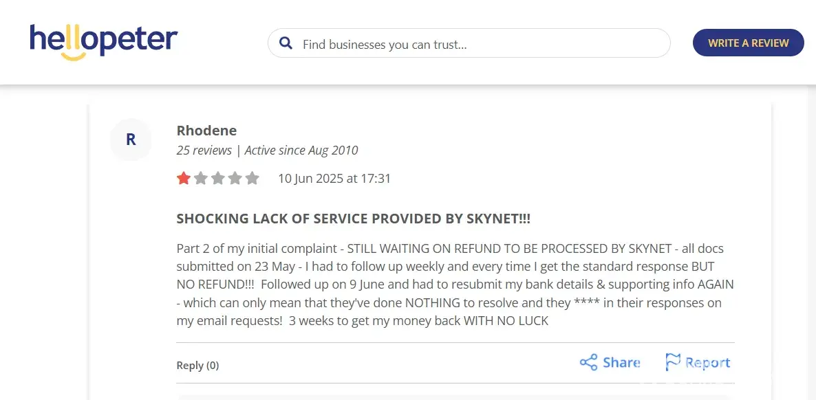 Skynet Worldwide Express has received 431 complaints on ComplaintsBoard. The first reported case, askig for charges for delivery of winning cheque fromfake companies, was published on Jun 11, 2008, and the most recent complaint, Refund not being paid, was posted on Jun 10, 2025.