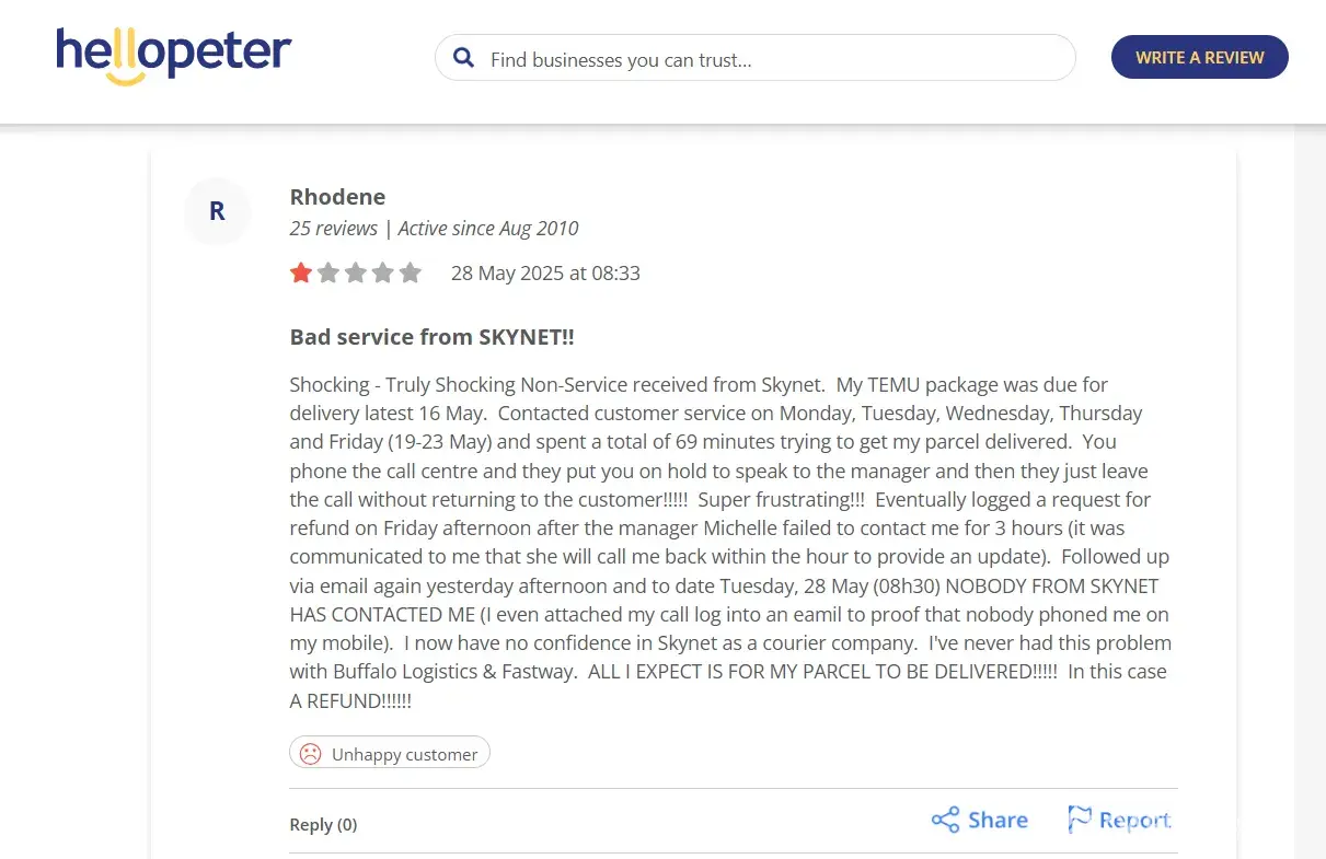 After reading through several reviews and considering the experiences shared by other customers, I must say that my interaction with Skynet Worldwide was extremely disappointing. The lack of transparency regarding third-party delivery companies, inaccurate tracking information, and prolonged delivery times have left me frustrated. It's evident that the service quality does not meet the expectations one would have for a courier company. I would caution potential customers to explore alternative options for their shipping needs.