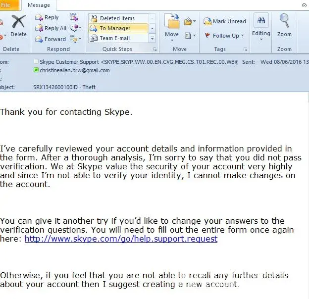 Following the last set of 'advice', I was told to follow steps that have resulted in my account being lost. I was offered now solution and was asked for my understanding. No one person in Skype gripped the issue and my requests to make a formal complaint have been ignored.
