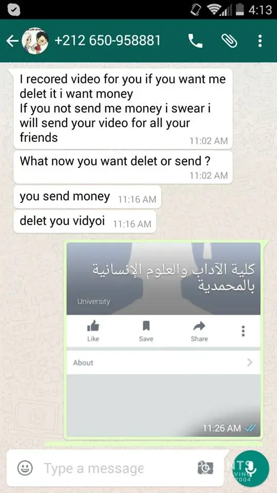 Dear Sir, I am naeem from pakistan. Yesterday I send a request on skype Salma. Rochdi I accept then video call only 10 minutes. After 10 minutes Salma. Rochdi asking me excuse me I am a boy and I record your fake video and pictures and I aslo hacked your facebook friends and family details you send me a money yes yea no. I ask no then my fake video uploaded in youtube and facebook all friends send it. please action this number please