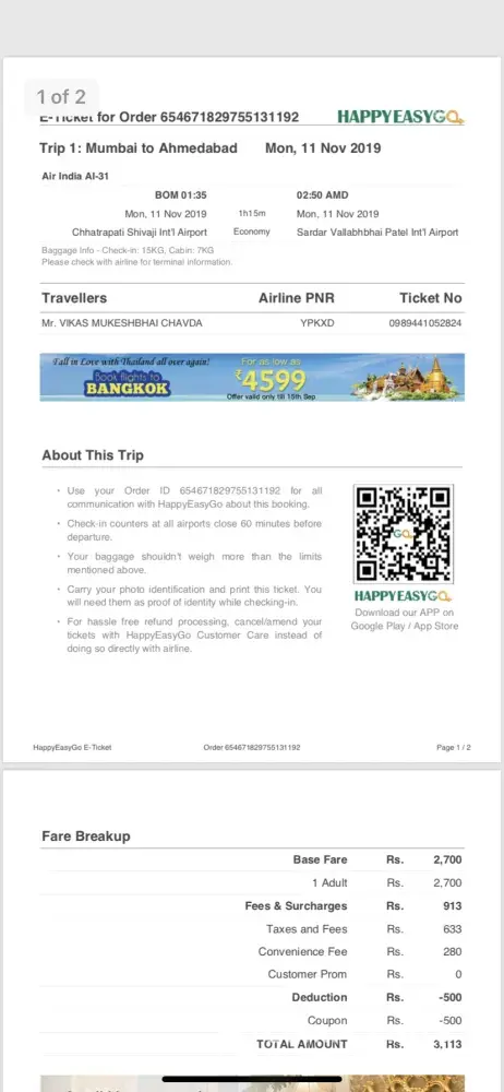 We have booked flight tickets on 'Happy Easy Go' on 26/08/2019 after being redirected from SkyScanner India; as they were showing cheapest tickets from London to Mumbai on the website for the day 07/11/2019.