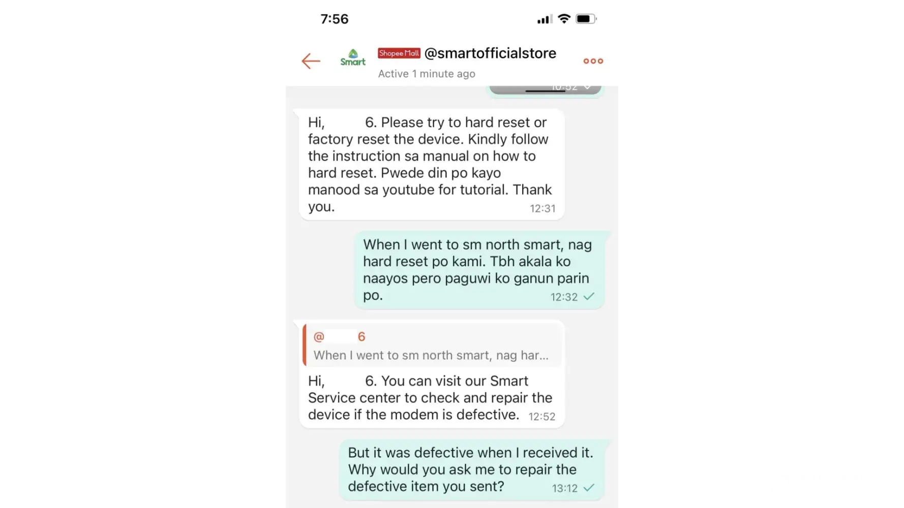 I had a chat with Smart's respresentative in shopee. they agreed that it's defective so they told me to go to a branch to get it replaced. I went to MOA but they told me they can't replace it since I didn't buy it from them. They told me to try their branch in SM North Edsa, so I went to SM North and they told me the same thing and that I should talk to Smart's representative in shopee for the refund.
