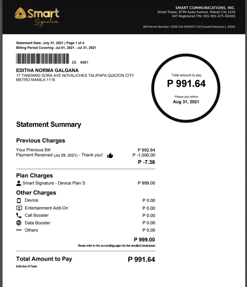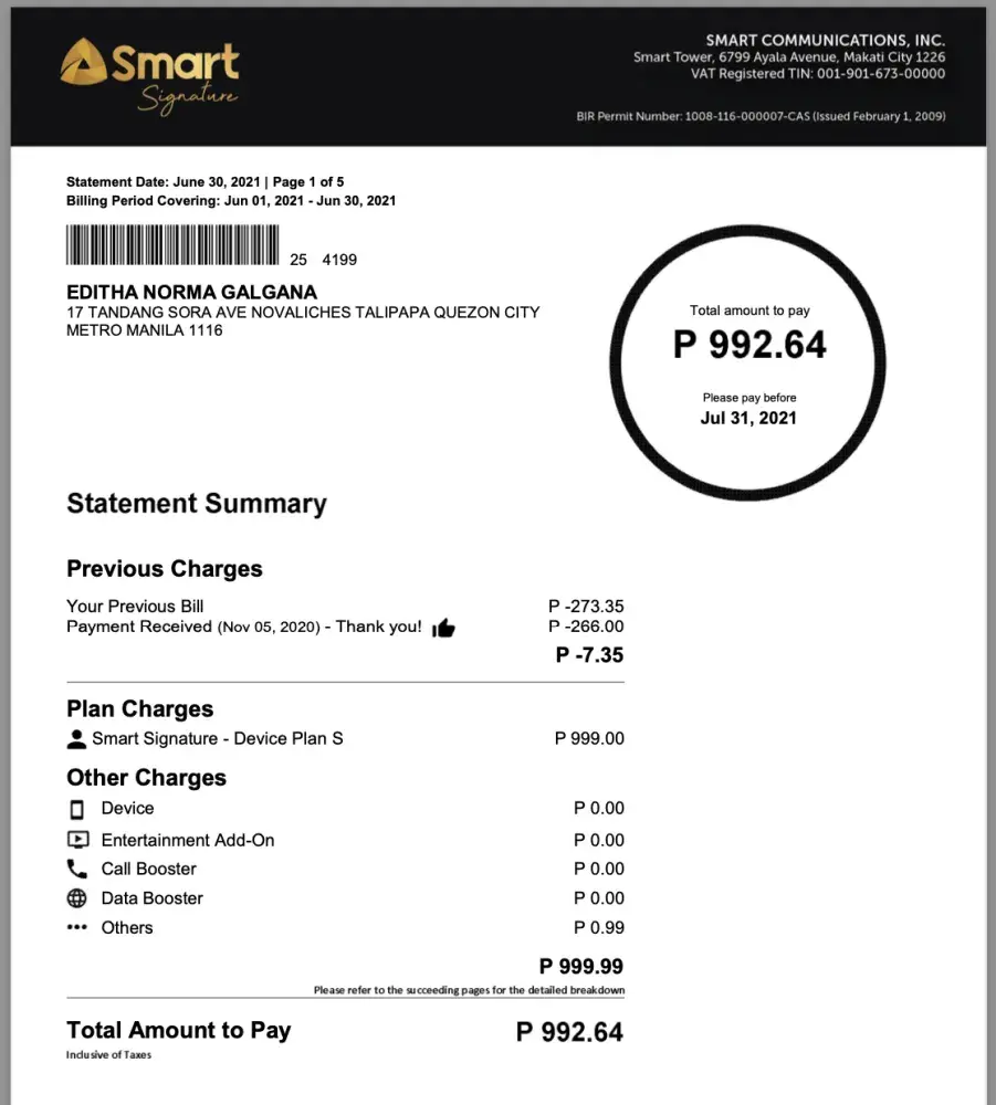 Another issue is I paid on this account twice last June 11 and 13 for P1000 each through Shopee and Paymaya. Smart said they see it and it's on the account yet it's not posted on the bill up to this day, so they took my payment from July 29 for the June bill. I have contacted Smart since July up to this day January 2022 but until now they haven't resolved this issue and they haven't given me back my money P266 and P2000 payment. I'm a senior citizen, I even went to their branch in Vertis North but still they can't resolve it as well. Showing you my June and July bill for proof.