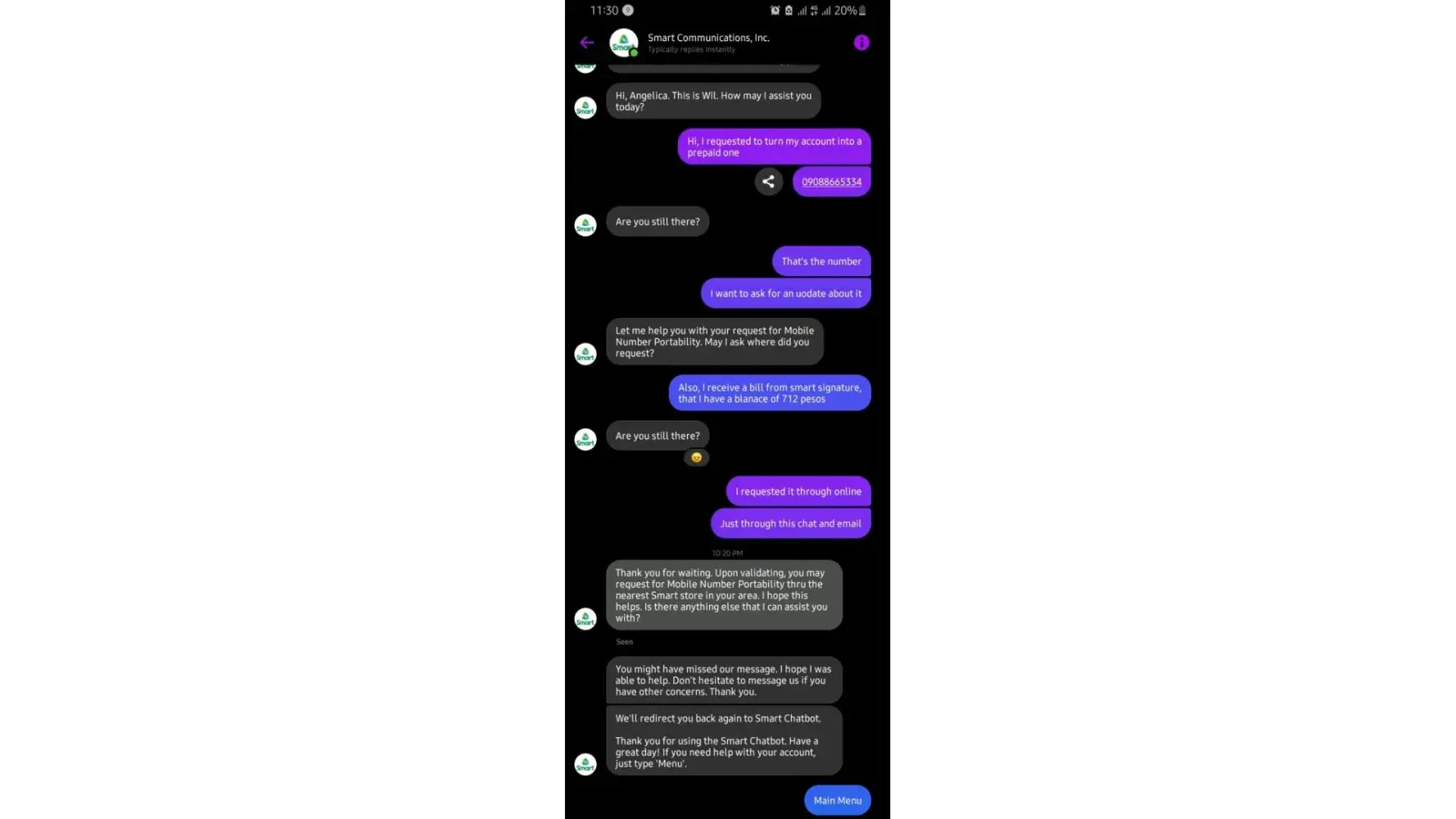 Just tonight, June 18, 2022 at 10 pm, I talked to an agent about my concerns, his name is Wil. I was not yet done explaining because he had questions which I have to answer first. My first message was sent at 10:15 pm as answer to his question "how may I assist you today?" which I received at 10:14 pm. At 10:15 pm also, he asked me are you still there? I replied at 10:16, he replied again at 10;16 and I replied too at 10:16 pm, then at 10:17 pm he asked me "are you still there?" And when I replied in just wothin a second he's not on the line anymore. He disconnected me. Oh my god! I was not yet done explaining for him to understand my concern. Obviously, you can check our messages. See for yourself if he was able to address my concern, it's like he doesn't want to help me with my concern. And honestly, this is the first time that I am complaining something like this because what he did was a disrespect.