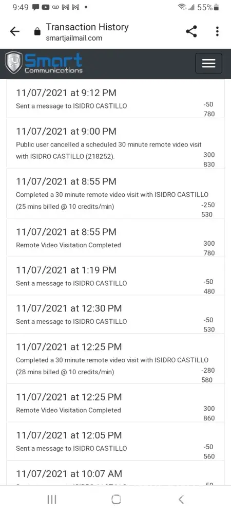 My husband is in Lubbock County Detention Center, Lubbock Texas. We have been continuously charged credits for visitations that are not delivered as advertised. I pay 300 credits EVERY day and 98%of the time recieve only 10-15 mins of a connection for these videos due to this companies technological issues. Yesterday, 11/7/21, once again...at 11am, smart communications took my credits and delivered NO VISIT AT ALL. I've request a return for those credits to my account 3 times, yet have not gotten them. I request returns on the credits I feel smart communications robs me all the time of, but do not receive them. I email tbe customer care department all the time, and do not get a response.