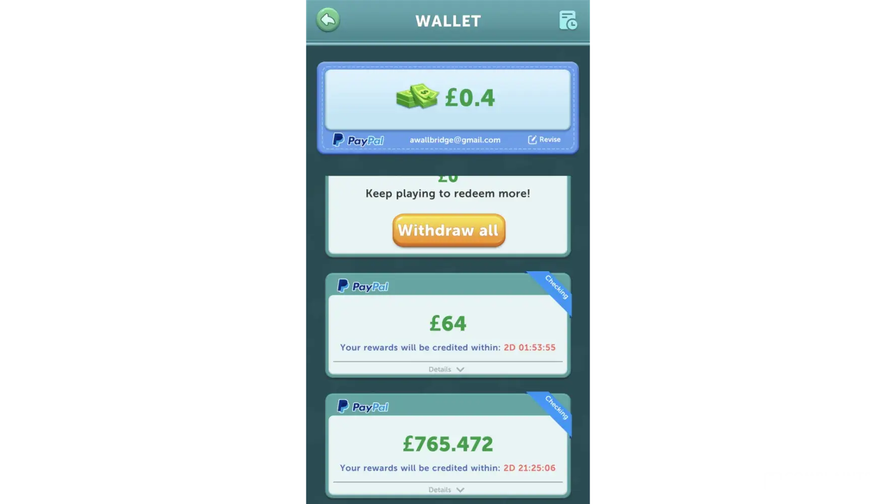 I thoroughly enjoy playing the game. I don’t even mind the ads. BUT….both I try to register my info for withdrawal, and even clicking to do the withdrawal, I keep getting an error message saying “no networkâ€. I have cellular enabled for the app, the game works to let me play, but I can’t put in my Paypal info or even go thru the withdrawal process â˜¹ï¸ Makes me sad, because I do enjoy playing. I emailed the developers a few hours ago…see what happens…fingers crossed.