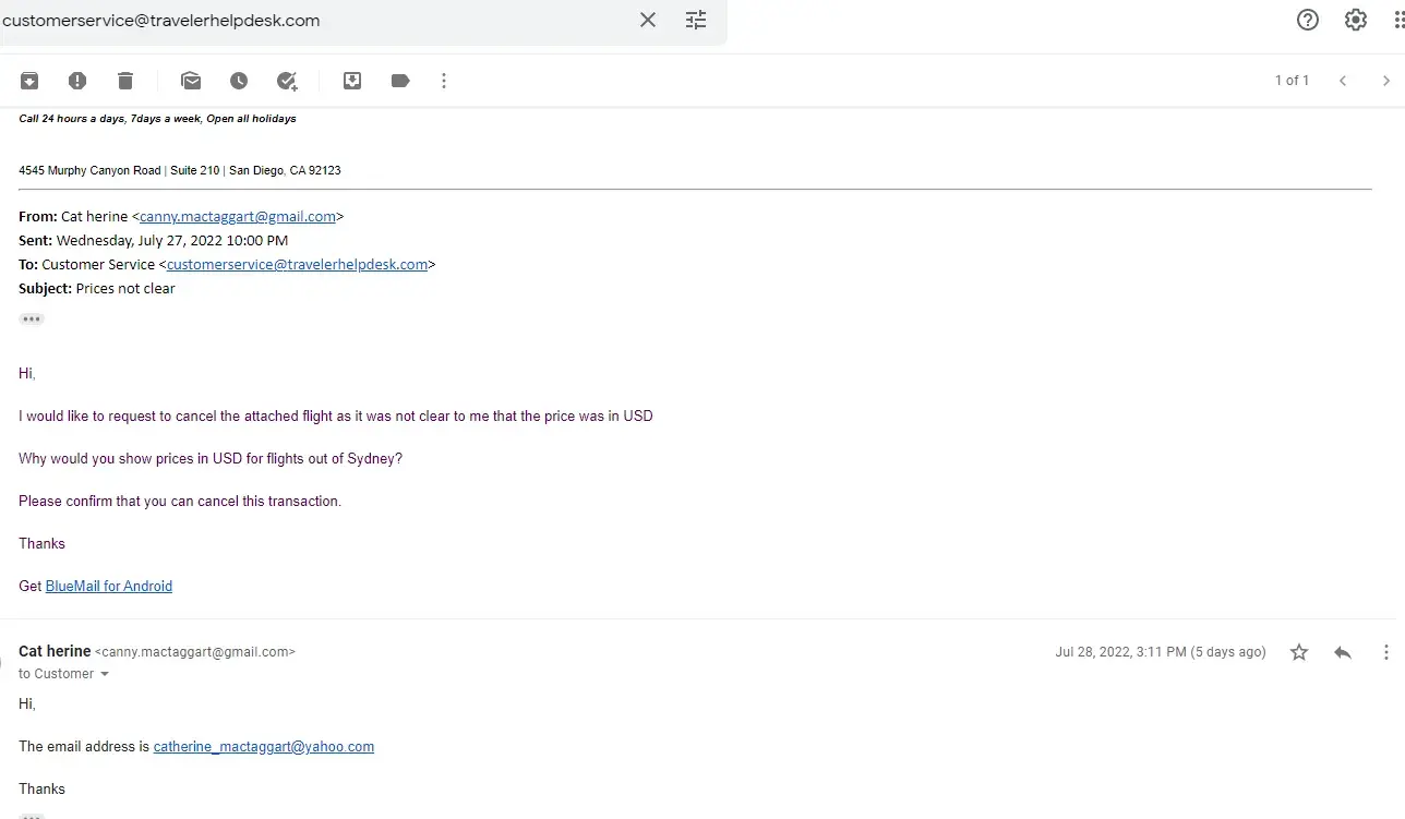 Desired outcome: FULL REFUND OF USD$1369.15.