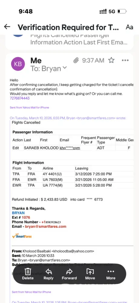 I tried booking on smartfares website, they didn’t confirm my booking, then an agent named Bryan called me and gave me an option of changing my route in order to get the discounted rate I tried to book, I refused then he asked me to confirm cancellation, I replied with a cancellation confirmation. Few days after I got charged twice for the same ticket.