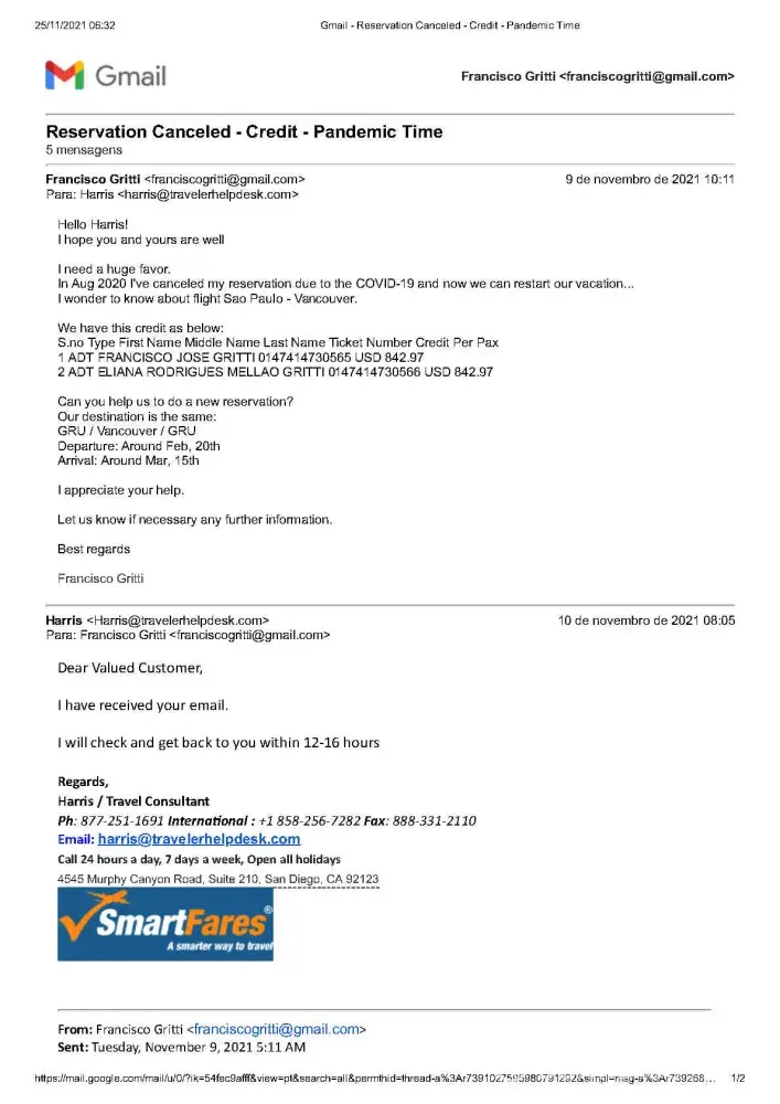 My concern is about losing the money I've paid more than US 1, 400 because as Smartfares information I have a timeline to use this money.