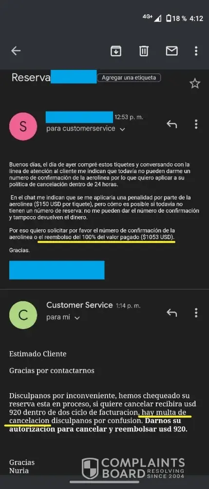 Being aware that the tickets rised it price in the airline webpage, I sent an email envoking their "Free cancellation within 24hours" policy, but they just denied it applying for a penalty of $133USD (email screenshot attached). I asked again today but they still didn't have a confirmation code from the airline.