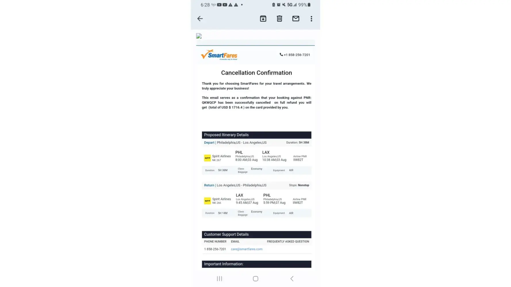 On may 18th, 2023 i booked a ticket same day got an email said spirit canceled my reservation i called spirit.com spirit say not them. Smartfares.com scammed me never refund my money everyday say 24hrs should get my money refunded it's been 15days nothing yet.