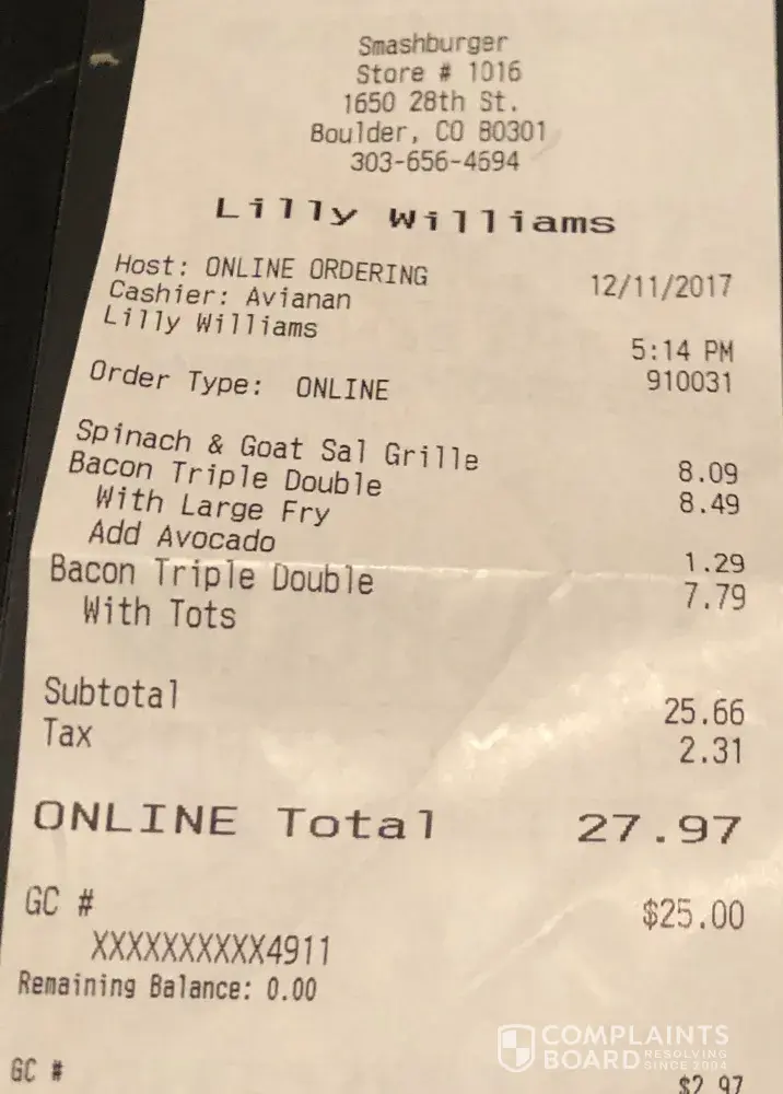 This website is not directly affiliated with Smashburger so they will likely not see your complaint here. You will want to contact them directly as soon as you are able.