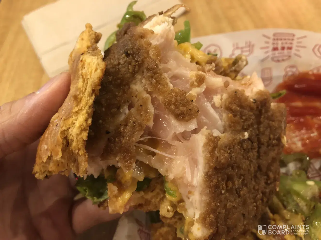 After several attempts of calling to the Smashburger customer service center and recorded messages on voicemail, it never got answered and returned the call. So I want to file the complaint here via online. On November 29th, 2017, I went to my local Smashburger restaurant to order "Colorado" crispy chicken sandwich. I ordered it then waited for about 10 min which is very normal. After my first bite of the sandwich, I suddenly noticed a raw chicken meat. I tore the sandwich apart in half and revealed that most of inside the chicken meat is still raw. I showed it to the shift leader guy, Jason. He was like oh sorry about it and did nothing afterward. I was expected to get full refund or coupon for free meal but nothing! I feel like the headquarter need to know about this but don't understand why they went being unresponsive and helpless? My words must be heard in this kind of situation of serving a raw chicken to customer. I took pictures of my meal as evidence.