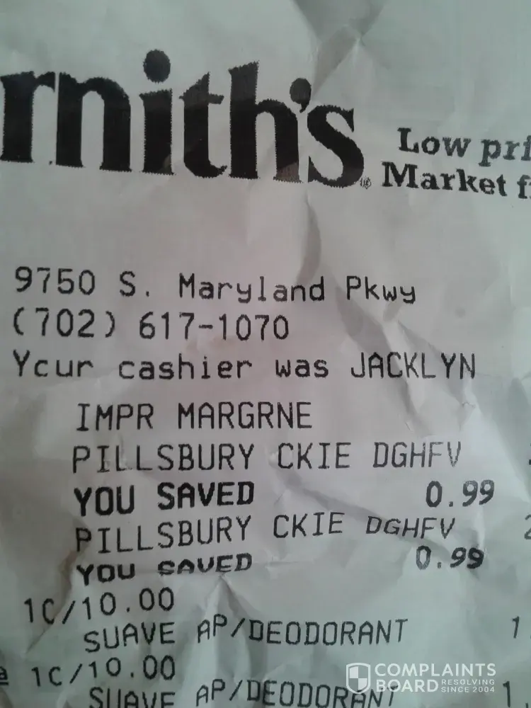 complaint against cashier employee named jacklyn at smiths at 9750 s maryland pkwy in las vegas nevada