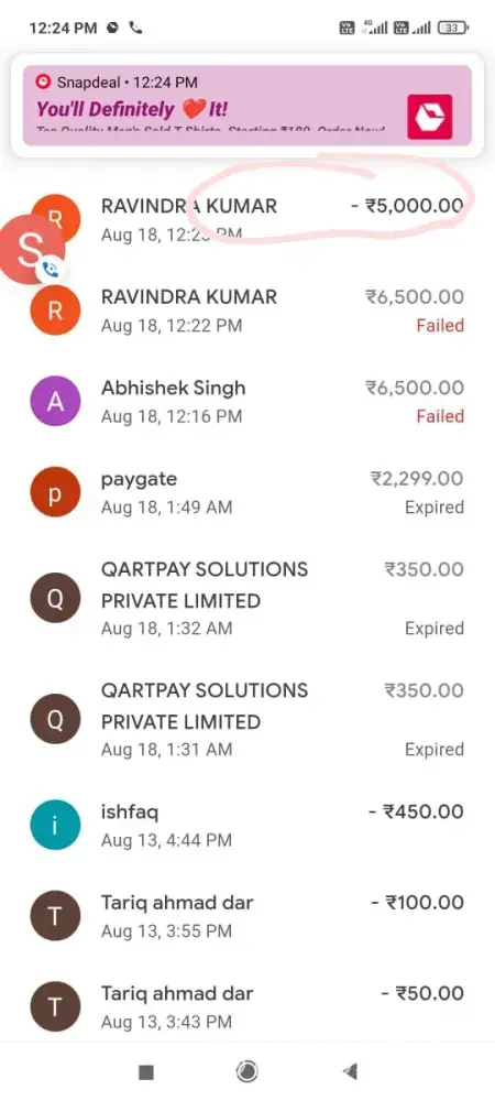 Sir snap deal staff called me we won the car and pay the amount 5200 rs and also shower the snap deal I'd card after I put it the price amount cannot credit the person cannot attend the call I am only put the rupees to the confident of snap deal Id card why snap deal company cheating me I want my money refund