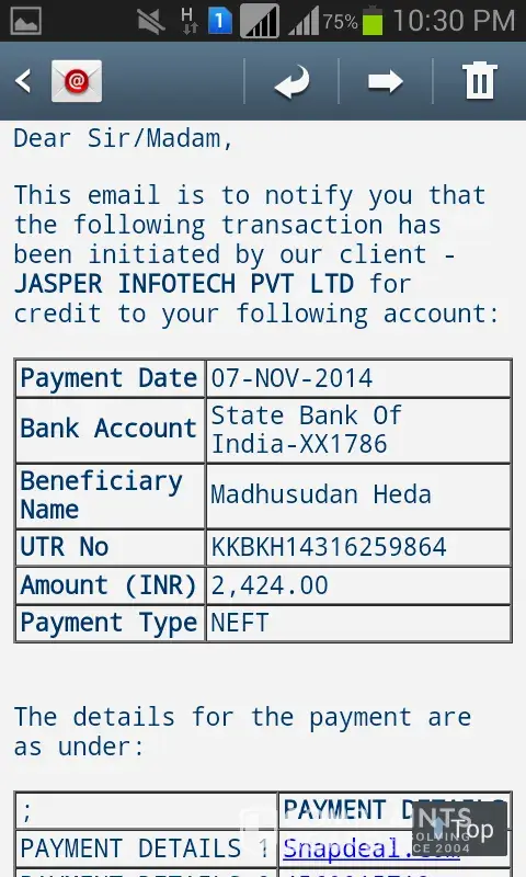 NEFT DETAILSRs 2, 424.00 has been transferred as per NEFT request from JASPER INFOTECH PVT LTD for credit to your account State Bank Of India-XX1786 vide UTR No.KKBKH14316259864. Please check with your bank for credit of funds