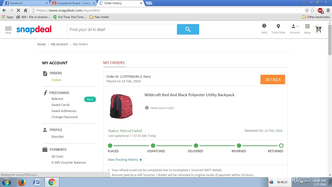 TODAY I CHECKED MY SNAPDEAL ACCOUNT IN THAT Order ID : [protected] WAS DELIVERED I AGREE BUT IN SAME I HAVE SENT RETURN THAT ALSO MENTION BUT TODAY ONLY DELIVERED SHOWING.