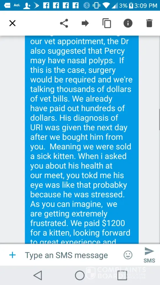 I am so sorry that your little kitten is so sick. When she saw my reviews she was so mad and kept going on and on about how I was hurting her and her family with my negative reviews. It is so messed up that she is trying to scam people, but also that these cats are obviously not well taken care of. I hope your kitty gets better. I think you posted on my Facebook review, I could not respond as she has made it so I could not. She is a horrible breeder. I