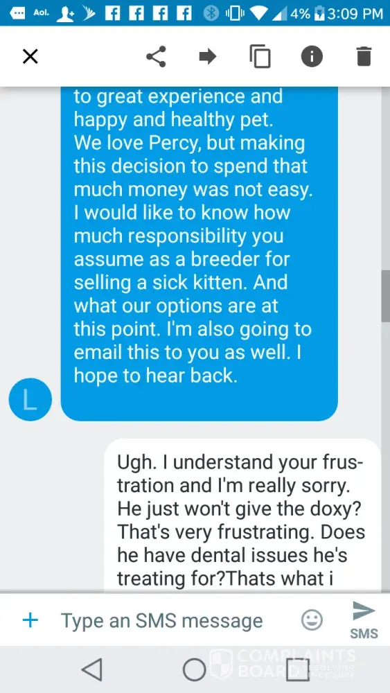 And to totally absolve a breeder from any responsibility is ridiculous. I did take responsibility for my part. I take care of my cat and I dealt with it. I'm filing a complaint to warn future customers. That's me taking responsibility.