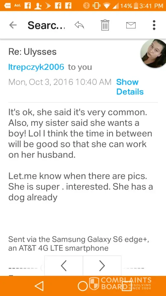An on a side note, she didn't honor her side of the contract either. I sent her my neuter paperwork and she never followed through with the paperwork after.