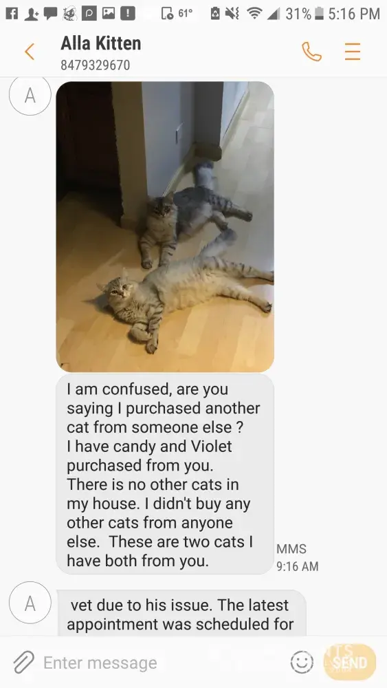 Well I can assure you that I am not a scam artist. I had lots of conversations with Anastasia during the process and she handled it all very poorly. The breakdown was on her side, not mine. She stopped communication with me once I pushed back on her about selling me a sick kitten. Selling a sick kitten falls on the breeder. I took my cat in the very next day and the vet confirmed it. Being upfront and honest in your business is something that is important. You can't blame the customer for being unhappy.