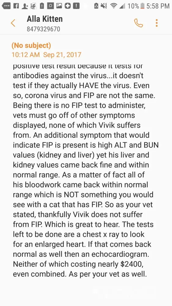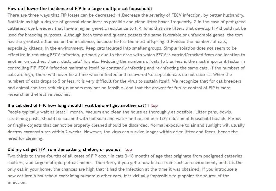 I only have one more piece of information to share with potential and past owners of Snowy Hollow cats, should FIP be suspected. Please Note: FIP only can be confirmed via necropsy [autopsy], which is a terribly expensive procedure, especially after an owner has spent $3, 000+ on kitten care. And, also is a useless and costly exercise when the breeder may have no interest in investigating his/her breeding conditions to learn if FIP is an issue. I am providing a screenshot here. However, if you wish to learn more, this website may be helpful: http://www.stopfip.org/faq.html. Bottom Line: If you are thinking about purchasing from a breeder, research deeply and listen to others who have purchased from the breeder you are considering.