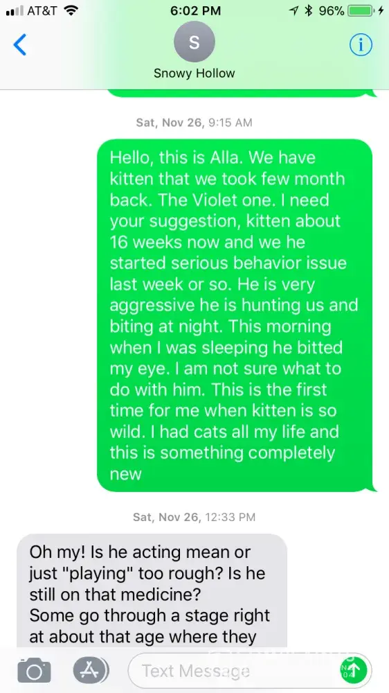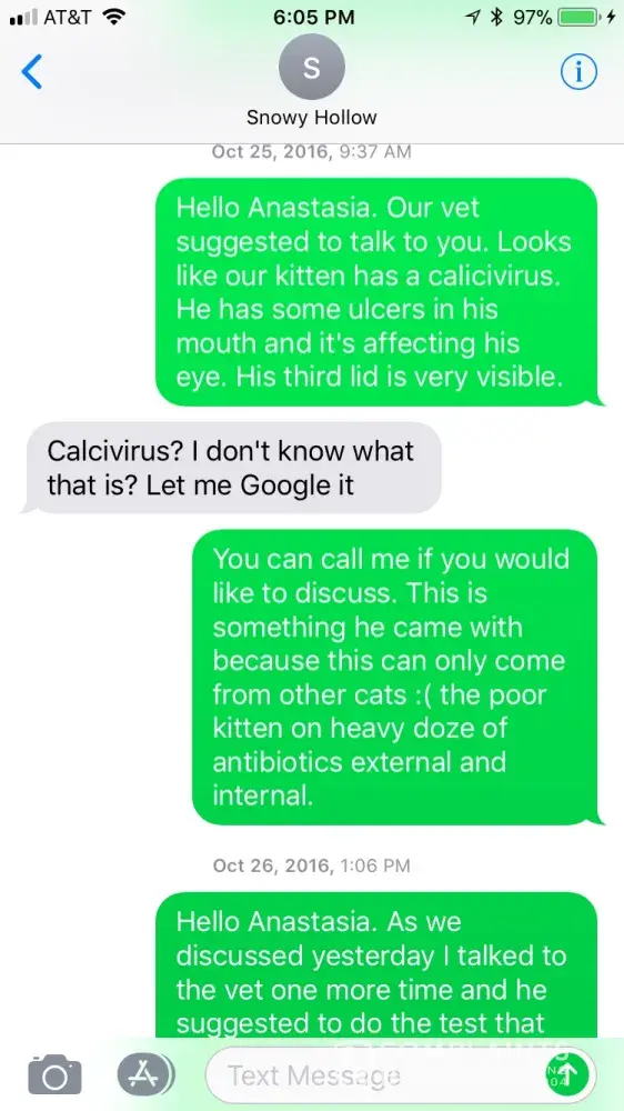 It's been 3 months since purchasing my kitten from Snowy Hollow the beginning of October 2016 and I cannot recommend you purchase a kitten from Anastasia. The day after we took her home we took him to the vet because we were kind of concerned about his eye. This was something that I asked her about when we went to pick him up. She told me that he wasn't sick and that sometimes that happens with kittens when they are stressed. The vet diagnosed him with an upper respiratory infection. I guess I have to take some responsibility for taking her word for it and not being more picky. Well in the past three months I've basically just had a sick kitten. He's probably only been well for about a week or two the whole time. And this is after lots of vet bills and visits. I've kept Anastasia in the loop about it and she is sympathetic but doesn't offer much else. I personally don't think it's very ethical breeding practice to sell a sick kitten to someone. Especially with the price tag that comes with them. Right now, my Percy has a bad eye. Same eye that I was suspicious of when I brought him home. My vet said that Percy has feline herpes. I have no other cats so he contracted it before I got him. Now that I am a unhappy customer, my emails don't get answered. I would steer clear. If a breeder can't guarantee a healthy kitten, then I can't in good conscience recommend them. Now I know that sometimes cats just get sick, but when I bring a new kitten home and the next day the vet says it's sick...well it was sick before I took it home. That falls in the breeders hands. We are attached to Percy now, but it's very upsetting to look at my expensive cat and see a cat with a bad eye. His third eyelid is halfway closed all the time and his pupil doesn't dilate correctly. It may or may not go away. Who knows. I suspect that we will have lots of vet bills in the future. Possibly a surgery. Steer clear and find another breeder. This was my first time buying a pure bred cat and it's been a very bad experience.
