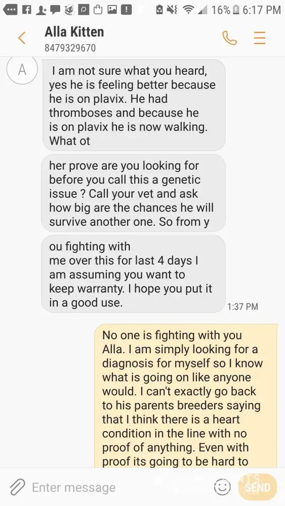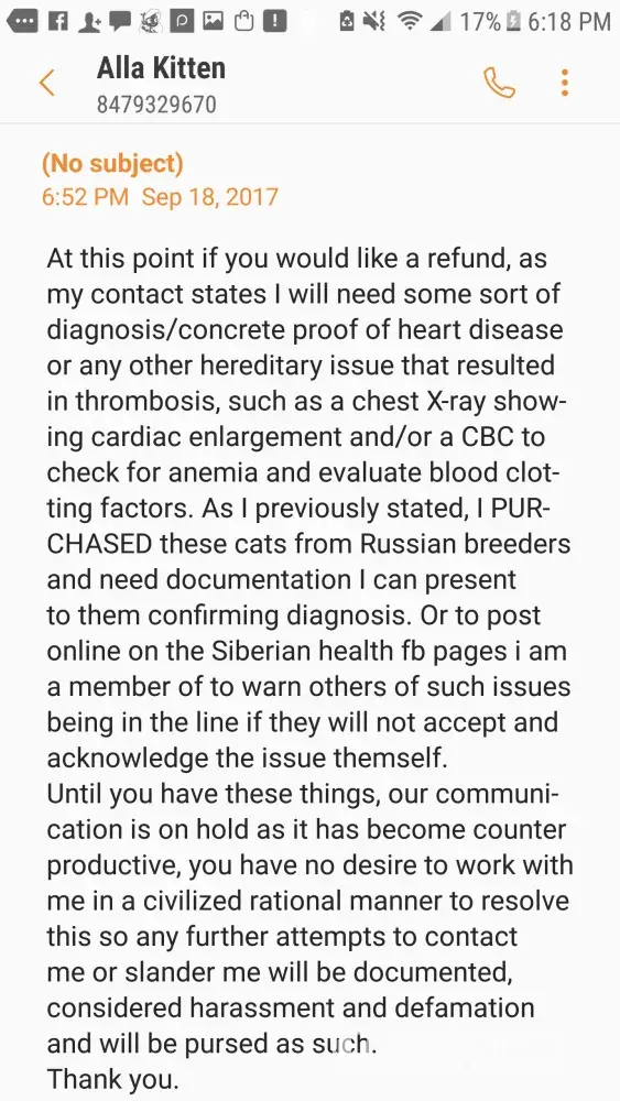 I feel like I’ve made my point here. I’ve pointed out your lack of diagnoses to your “claims” and I’ve also pointed out that your complaints and demands are about things that are not covered on the contracts you signed on your kittens you’ve purchased. The information Anastasia has speaks for itself. She has all the communications with the 3 of you that show she has upheld every aspect of her end of her contract and guarantee. You don’t get to buy a kitten, sign a contract agreeing to terms then try to change those terms after...such as demanding to keep a kitten and receive a refund...demanding a breeder to pay for tests and an illness that isn’t covered in the guarantee...not spaying/neutering the cats you recieve and then expecting your contract to be honored when you clearly didn’t honor your end of it. The amount of entitlement you threw women have is disgusting. Take responsibility for your actions, decisions, purchases and actually READ the extent of the contracts you signed. The breeder has completely upheld her end...I cannot say the same for you. This thread actually is a good warning...a warning to other breeders not to deal with you and other buyers like you. I feel extremely sorry for Anastasia and the harassment and bullying and irrational demands you have put through. YOU all should be ashamed of yourselves!