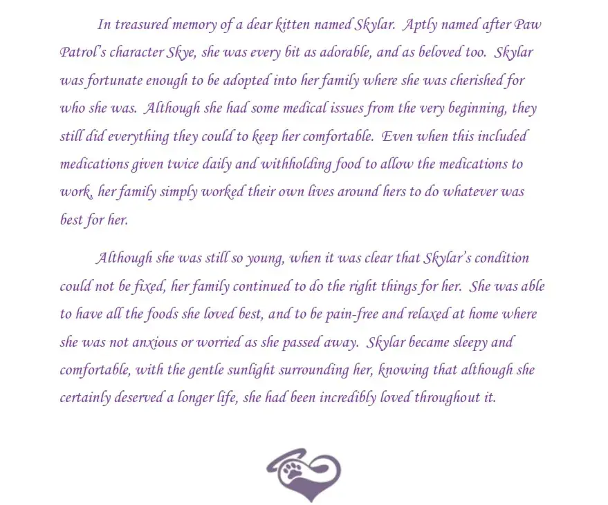 Lastly, it has been questioned in this site whether Sky really was euthanized, or still is alive. Unfortunately, I do not have a copy of Lap of Love's invoice for her in-home euthanization. However, I am attaching the 'memory' that Juliana Lyles, DVM, sent me about Sky.