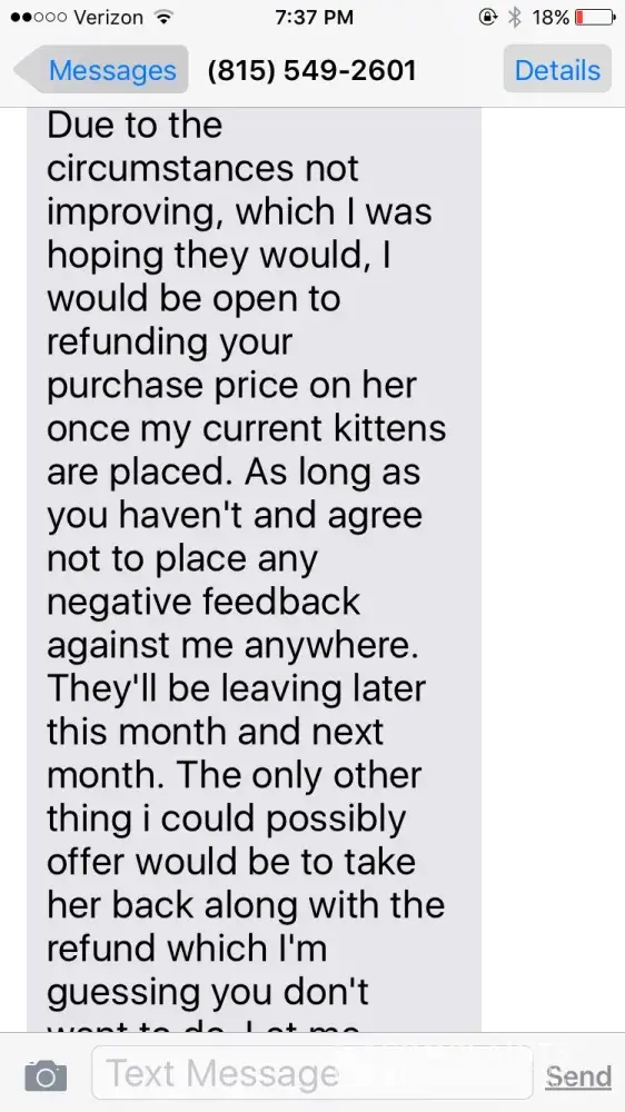 Anastasia the only reason why this thread got out of control was because of your friend Jen Vercammen. The only reason why I even posted anymore on here was because I was being attacked. I don't know anything about any breeding issues and I never commented on that because I don't know much about it. My continued updates we're because you sent your friend on here to call me stupid and fat, all unprofessional. In fact, you are the more professional one in your responses. I just really think she did you more harm than good. Honestly I would have been more open to speaking more with you about my situation personally, but you shut it down after I posted this review. I admit I find it very sad that a kitten died. That part also is hard for me to understand. That you feel no empathy for your customer's situation. Really outside all the [censor]. We are all people. Real people with real feelings about things. I honestly wish that instead of sicking Jen on us you communicated with us. And if you can't communicate with anyone else, you knew you could have with me.